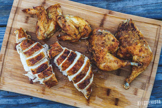 One last thing. This technique is what you should be practicing for Thanksgiving. You can cook a turkey in the same way, it's just a bigger bird to handle. Of course, there are some extra tricks to add to your process if you want to do things like collect the drippings for a good gravy. You lose the classic Norman Rockwell picturesque roasted turkey presentation, but honestly - is your goal to replicate a painting from the 40's or is it to serve properly cooked poultry? That's what I thought. And if you're really concerned about presentation, focus on how you carve the bird. I've made some beautiful presentations from spatchcocked birds. I'm wrapping up my new Thanksgiving ebook for release later this month, with all the details you'll need about spatchcocking turkeys! In the meantime, your assignment: Roast a chicken every weekend. Seriously. Good practice, you'll be able to freeze a surplus of bones to use for stock, and roasted chickens are an easy option to feed a family or provide several portions of meat for meal prep. Take photos of your roasted chickens and tag them with #kitchenista so I can check out your progress!